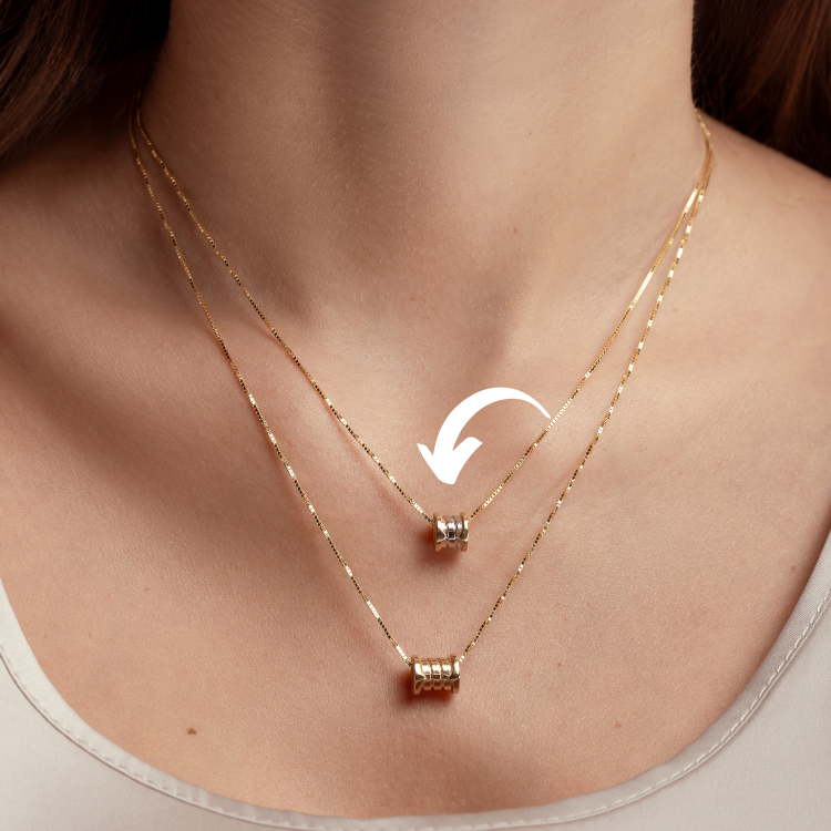 تتميز القلادة بتصميم بكرة دائرية صغيرة مُصنعة بدقة فائقة، مزينة بالذهب الأبيض والذهب الأصفر، مما يخلق تباينًا ساحرًا يجذب الأنظار. تضيف سلسلة الصندوق المرافقة لمسة من الرقي وتكمل المظهر العام بكمال.